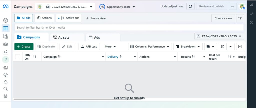 Tampilan dashboard Facebook Ads Manager dengan tombol Create untuk mengatur dan mengelola iklan digital